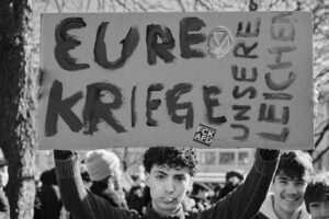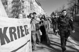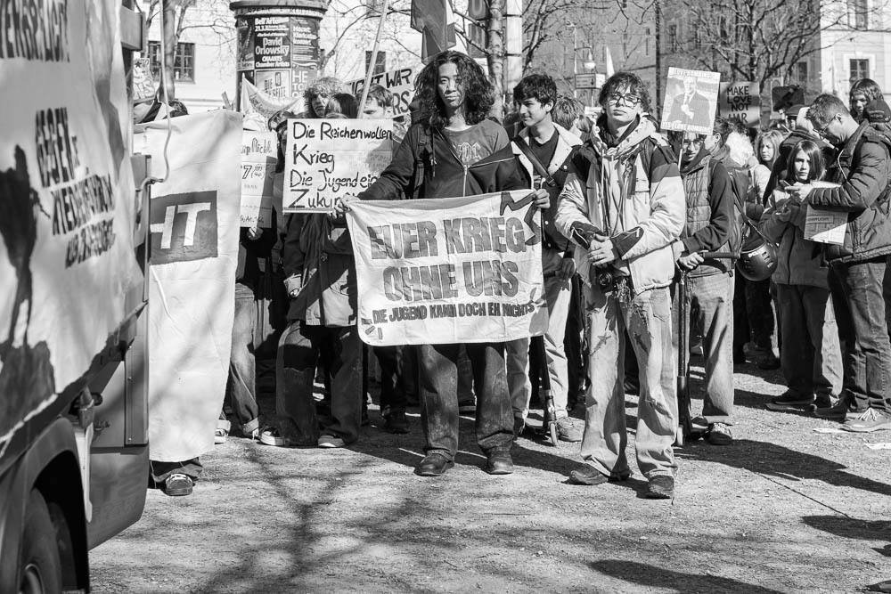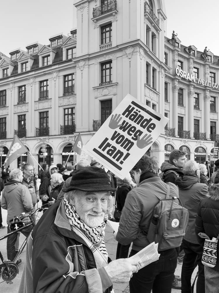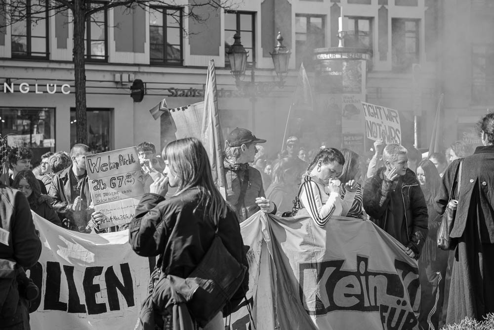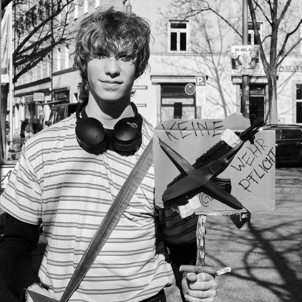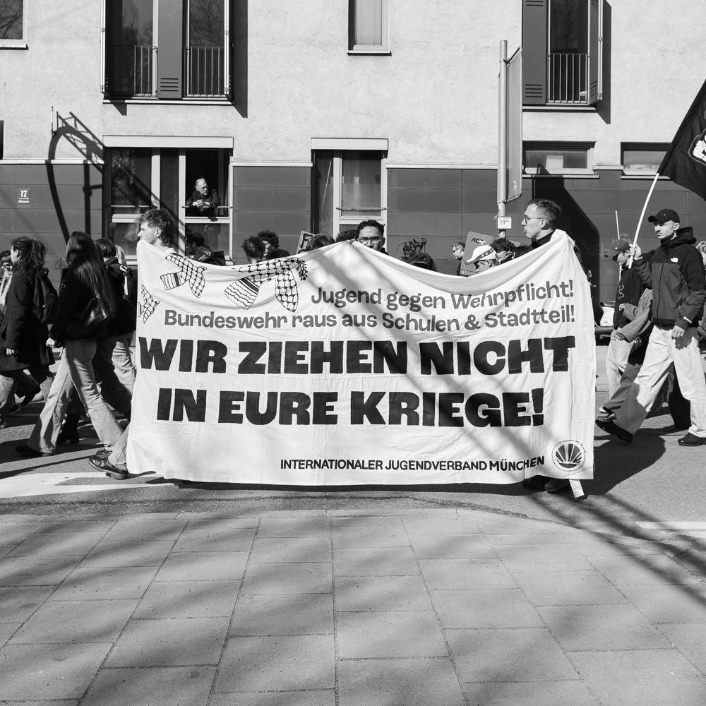 Savaşın Gölgesinde Barış: İran ve Gelecek Direnişi Dünyanın birçok yerinde süregelen çatışmaların, özellikle de İran Savaşı’nın gölgesi Münih sokaklarına kadar uzandı. Savaşın durdurulması için yapılan kitlesel eylemler ve Almanya’nın bu süreçteki rolüne karşı yükselen sesler, serinin en dramatik karelerini oluşturdu. Buna paralel olarak, Zorunlu Askerliğe (Wehrpflicht) karşı çıkan öğrencilerin haklı direnişi, barışın ve özgürlüğün sesini monokrom bir dille ölümsüzleştirdi.