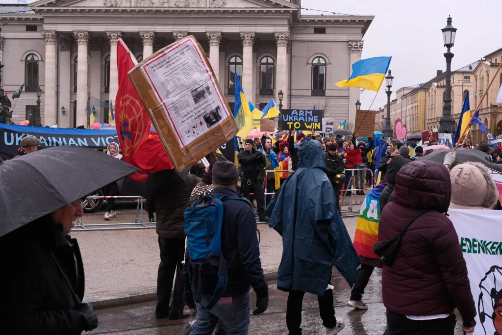 Yoğun yağmura rağmen insanlar dağılmadı. Yol üzerinde Odeonsplatz da bir grup Querdenker 250 metre ileride Opera’nin önünde Ukraynalı bir grubun pankartları dikkat çekiyordu.